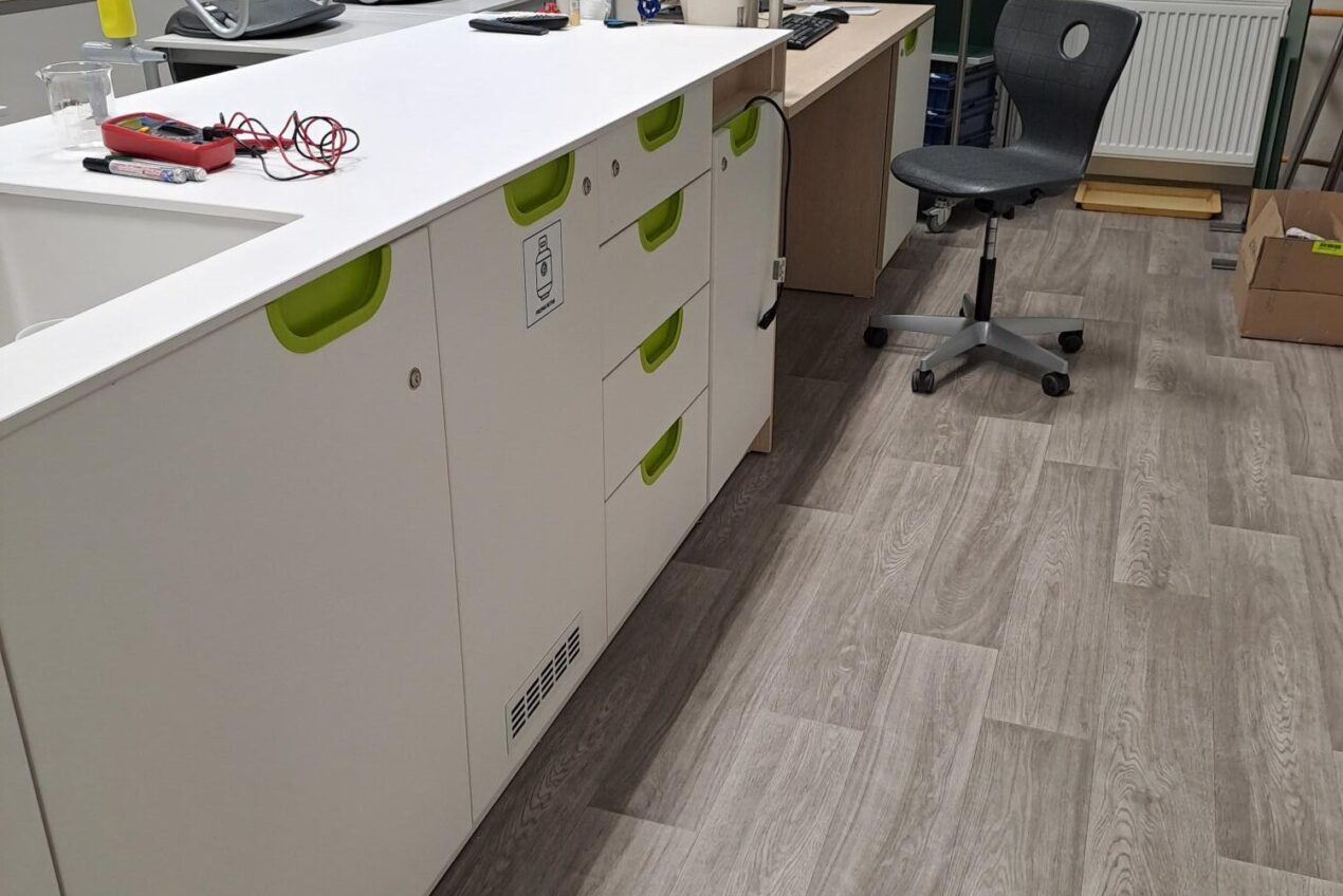 Proběhla také výměna elektroinstalace a datových rozvodů, rekonstrukce podlah a vnitřních povrchů. Na čelní stěně došlo k demontáži umyvadla včetně obkladu, následně byla v celé ploše čelní stěny provedena konstrukce SDK předstěny, byla instalována klimatizační jednotka, osazena specializovaná katedra učitele. Demonstrační část byla vybavena zásuvkou, plynovým kahanem a dřezem. U zadní stěny učebny byla umístěna sestava šesti skříní s výškou 3 m. U boční stěny s dveřmi byl umístěn pracovní žákovský pult se třemi umyvadly a akustická nástěnka. Učebna byla vybavena šesti pevnými stoly pro tři žáky a dvanácti mobilními jednomístnými stoly. V čele třídy byl instalován centrální zobrazovač na pylonovém pojezdu s křídly, na boční stěnu sekundární displej na fixním držáku a do katedry učitele pak prezentační a výukové technologie. Pro odbornou učebnu byly pořízeny tablety a také řada pomůcek jako např. Van de Graaffův generátor, laser, vakuová pumpa, souprava elektřina, sada elektronika či stavebnice elektromagnetismus.